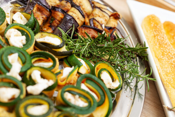 Zucchinirouladen mit Mozzarella, Knoblauch, Minze, Olivenöl, Balsamico, Salz und Pfeffer